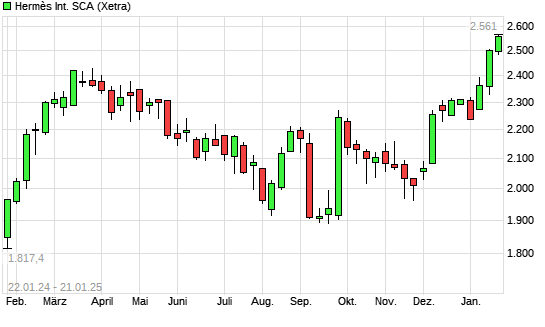 Mit dem Anstieg auf 2.497,00 EUR hat die Hermès-Aktie (ISIN FR0000052292) am 20.01.2025 ein neues All-Time-High erreicht und damit den Kurs vom 17.01.2025 eingestellt.