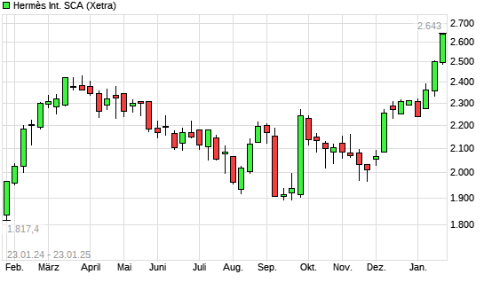 Mit dem Anstieg auf 2.608,00 EUR hat die Hermès-Aktie (ISIN FR0000052292) am 22.01.2025 ein neues All-Time-High erreicht und damit den Kurs vom 21.01.2025 eingestellt.