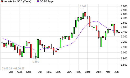 Mit dem Rücksetzer auf 2.379,00 EUR hat die Hermès-Aktie am 02.06.2025 die 50-Tage-Linie nach unten gekreuzt.
