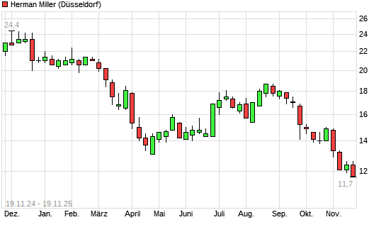 Mit dem Rücksetzer auf 11,90 EUR hat die Herman Miller-Aktie (ISIN US6005441000) am 18.11.2025 ein neues 10-Jahres-Tief erreicht und damit den Kurs vom 11.11.2025 eingestellt.