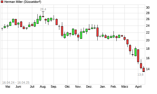 Mit dem Rücksetzer auf 14,10 EUR hat die Herman Miller-Aktie (ISIN US6005441000) am 15.04.2025 ein neues 12-Monats-Tief erreicht und damit den Kurs vom 09.04.2025 eingestellt.