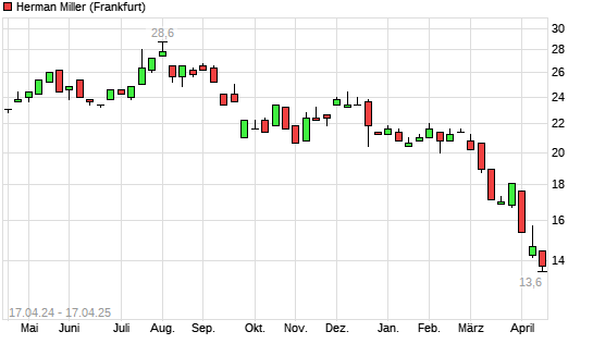 Mit dem Rücksetzer auf 13,60 EUR hat die Herman Miller-Aktie (ISIN US6005441000) am 16.04.2025 ein neues 12-Monats-Tief erreicht und damit den Kurs vom 15.04.2025 eingestellt.