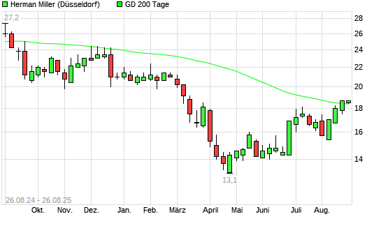 Mit dem Anstieg auf 18,70 EUR hat die Herman Miller-Aktie am 25.08.2025 die 200-Tage-Linie nach oben gekreuzt.