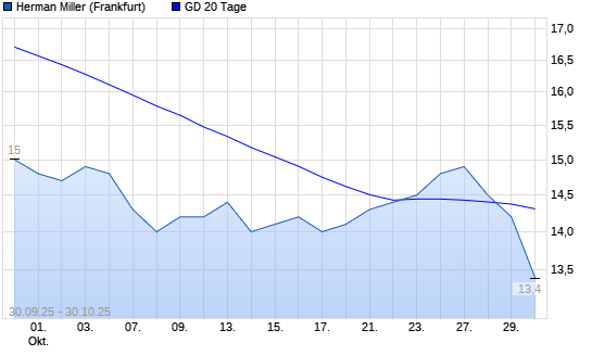 Mit dem Rücksetzer auf 14,20 EUR hat die Herman Miller-Aktie am 29.10.2025 die 20-Tage-Linie nach unten gekreuzt.