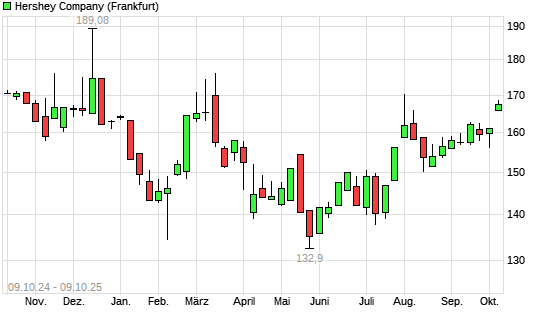 Mit dem Anstieg auf 168,54 EUR hat die Hershey Company-Aktie (ISIN US4278661081) am 08.10.2025 ein neues 6-Monats-Hoch erreicht und damit den Kurs vom 07.10.2025 eingestellt.