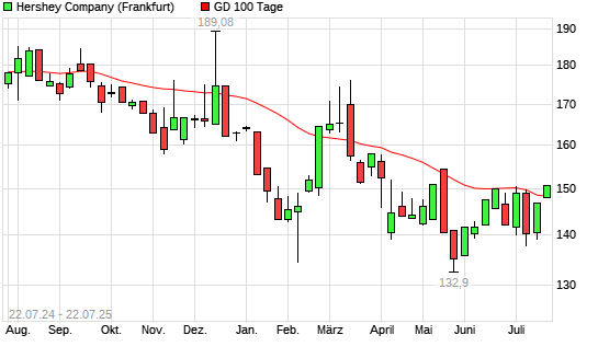 Mit dem Anstieg auf 147,96 EUR hat die Hershey Company-Aktie am 21.07.2025 die 100-Tage-Linie nach oben gekreuzt.