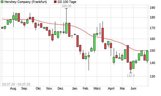 Mit dem Rücksetzer auf 148,64 EUR hat die Hershey Company-Aktie am 02.07.2025 die 100-Tage-Linie nach unten gekreuzt.