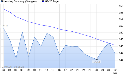 Mit dem Rücksetzer auf 146,18 EUR hat die Hershey Company-Aktie am 02.05.2025 die 20-Tage-Linie nach unten gekreuzt.
