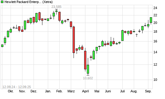 Mit dem Anstieg auf 21,23 EUR hat die Hewlett Packard Enterprise-Aktie (ISIN US42824C1099) am 11.09.2025 ein neues 6-Monats-Hoch erreicht und damit den Kurs vom 10.09.2025 eingestellt.