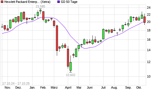 Mit dem Rücksetzer auf 19,29 EUR hat die Hewlett Packard Enterprise-Aktie am 16.10.2025 die 50-Tage-Linie nach unten gekreuzt.