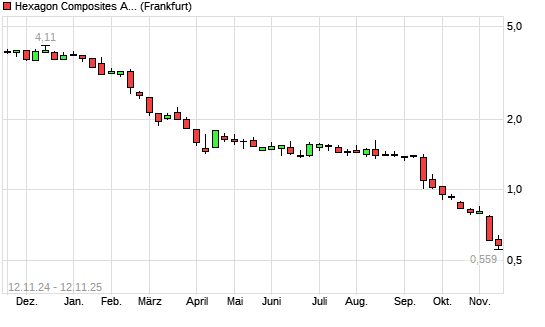 Mit dem Rücksetzer auf 0,56 EUR hat die Hexagon Composites-Aktie (ISIN NO0003067902) am 11.11.2025 ein neues All-Time-Low erreicht und damit den Kurs vom 07.11.2025 eingestellt.
