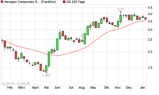Mit dem Anstieg auf 3,66 EUR hat die Hexagon Composites-Aktie am 10.01.2025 die 100-Tage-Linie nach oben gekreuzt.