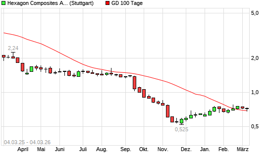 Mit dem Rücksetzer auf 0,68 EUR hat die Hexagon Composites-Aktie am 03.03.2026 die 100-Tage-Linie nach unten gekreuzt.