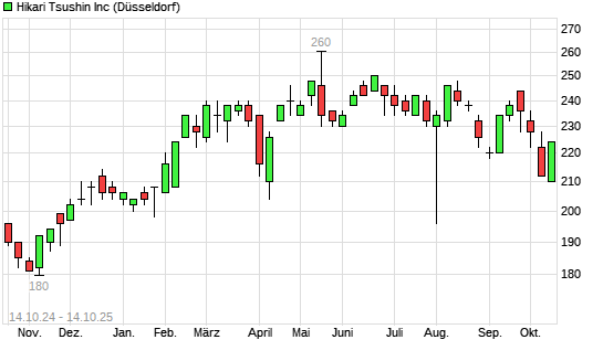 Mit dem Rücksetzer auf 218,00 EUR hat die Hikari Tsushin-Aktie (ISIN JP3783420007) am 13.10.2025 ein neues 6-Monats-Tief erreicht und damit den Kurs vom 02.09.2025 eingestellt.