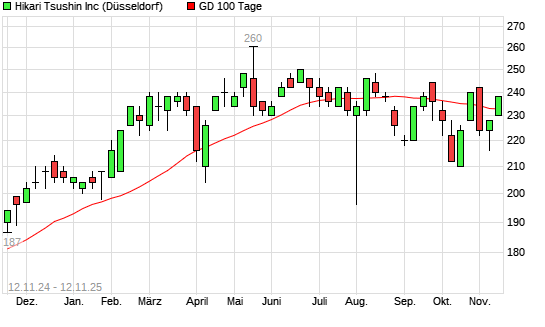 Mit dem Anstieg auf 236,00 EUR hat die Hikari Tsushin-Aktie am 11.11.2025 die 100-Tage-Linie nach oben gekreuzt.