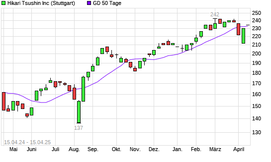 Mit dem Anstieg auf 240,00 EUR hat die Hikari Tsushin-Aktie am 14.04.2025 die 50-Tage-Linie nach oben gekreuzt.