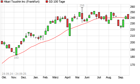Mit dem Rücksetzer auf 240,00 EUR hat die Hikari Tsushin-Aktie am 23.09.2025 die 100-Tage-Linie nach unten gekreuzt.