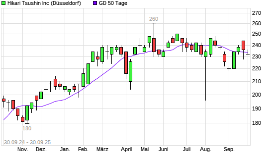Mit dem Rücksetzer auf 236,00 EUR hat die Hikari Tsushin-Aktie am 29.09.2025 die 50-Tage-Linie nach unten gekreuzt.