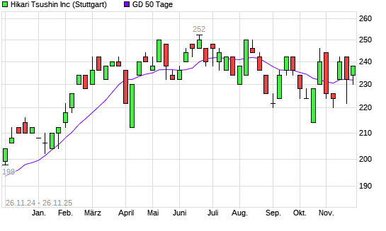 Mit dem Rücksetzer auf 230,00 EUR hat die Hikari Tsushin-Aktie am 25.11.2025 die 50-Tage-Linie nach unten gekreuzt.