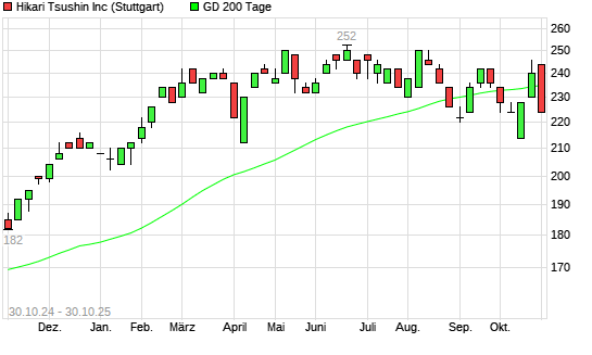 Mit dem Rücksetzer auf 230,00 EUR hat die Hikari Tsushin-Aktie am 29.10.2025 die 200-Tage-Linie nach unten gekreuzt.Die Hikari Tsushin-Aktie befand sich seit dem 21.10.2025 im langfristigen ...weiterlesen