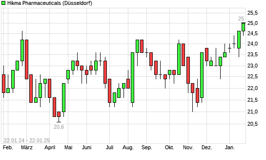 Mit dem Anstieg auf 25,00 EUR hat die Hikma Pharmaceuticals-Aktie (ISIN GB00B0LCW083) am 21.01.2025 ein neues 12-Monats-Hoch erreicht und damit den Kurs vom 17.01.2025 eingestellt.