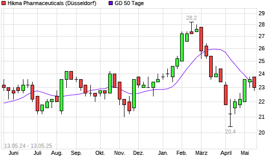 Mit dem Rücksetzer auf 23,40 EUR hat die Hikma Pharmaceuticals-Aktie am 12.05.2025 die 50-Tage-Linie nach unten gekreuzt.