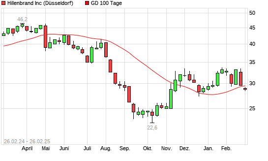 Mit dem Rücksetzer auf 28,60 EUR hat die Hillenbrand-Aktie am 25.02.2025 die 100-Tage-Linie nach unten gekreuzt.