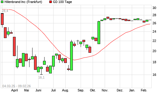 Die Hillenbrand-Aktie befindet sich seit dem 14.10.2025 im langfristigen Aufwärtstrend und hat in diesem Zeitraum +21,20% an Wert gewonnen. Der Abstand zur 200-Tage-Linie beträgt aktuell +15,80%.