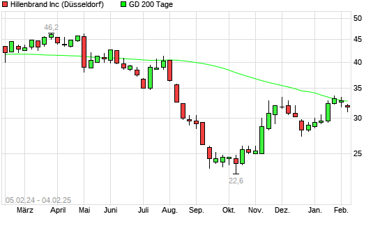 Mit dem Rücksetzer auf 32,20 EUR hat die Hillenbrand-Aktie am 03.02.2025 die 200-Tage-Linie nach unten gekreuzt.