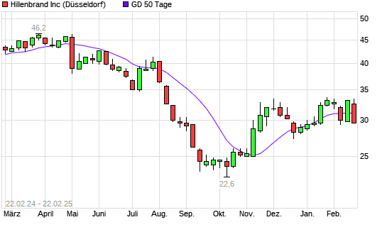 Mit dem Rücksetzer auf 30,60 EUR hat die Hillenbrand-Aktie am 21.02.2025 die 50-Tage-Linie nach unten gekreuzt.