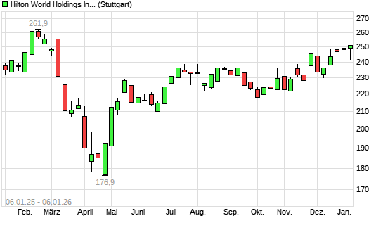 Mit dem Anstieg auf 249,60 EUR hat die Hilton-Aktie (ISIN US43300A2033) am 05.01.2026 ein neues 6-Monats-Hoch erreicht und damit den Kurs vom 18.12.2025 eingestellt.