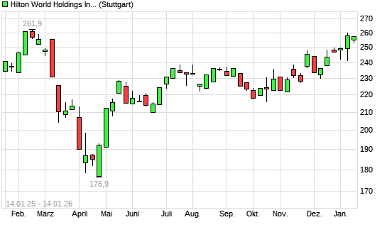 Mit dem Anstieg auf 256,00 EUR hat die Hilton-Aktie (ISIN US43300A2033) am 13.01.2026 ein neues 6-Monats-Hoch erreicht und damit den Kurs vom 09.01.2026 eingestellt.