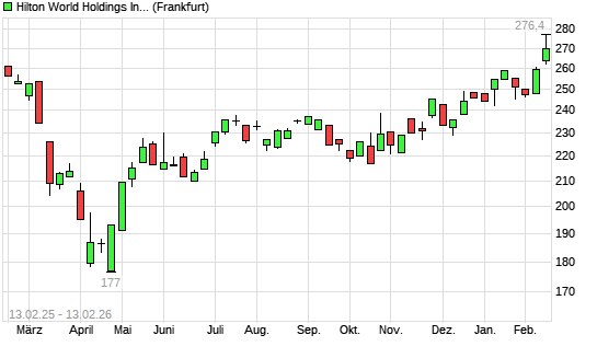 Mit dem Anstieg auf 276,20 EUR hat die Hilton-Aktie (ISIN US43300A2033) am 12.02.2026 ein neues All-Time-High erreicht und damit den Kurs vom 11.02.2026 eingestellt.