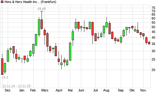 Mit dem Rücksetzer auf 34,41 EUR hat die Hims & Hers Health A-Aktie (ISIN US4330001060) am 11.11.2025 ein neues 6-Monats-Tief erreicht und damit den Kurs vom 25.06.2025 eingestellt.