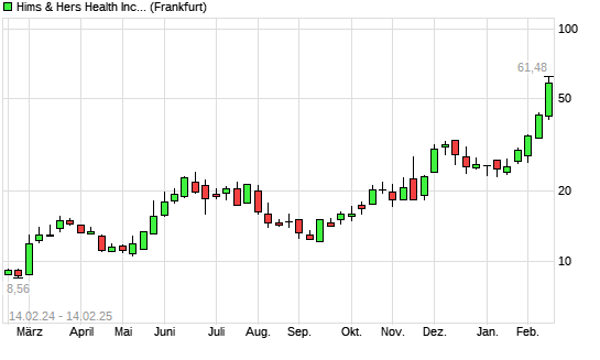 Mit dem Anstieg auf 54,74 EUR hat die Hims & Hers Health A-Aktie (ISIN US4330001060) am 13.02.2025 ein neues All-Time-High erreicht und damit den Kurs vom 12.02.2025 eingestellt.