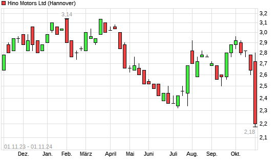 Mit dem Rücksetzer auf 2,14 EUR hat die Hino Motors-Aktie (ISIN JP3792600003) am 31.10.2024 ein neues 10-Jahres-Tief erreicht und damit den Kurs vom 10.07.2024 eingestellt.