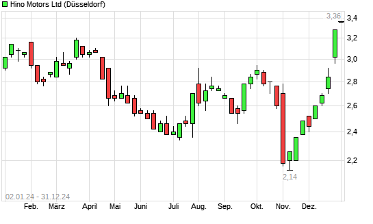 Mit dem Anstieg auf 3,36 EUR hat die Hino Motors-Aktie (ISIN JP3792600003) am 30.12.2024 ein neues 12-Monats-Hoch erreicht und damit den Kurs vom 27.12.2024 eingestellt.