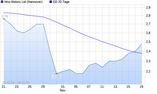 Mit dem Anstieg auf 2,36 EUR hat die Hino Motors-Aktie am 18.11.2024 die 20-Tage-Linie nach oben gekreuzt.