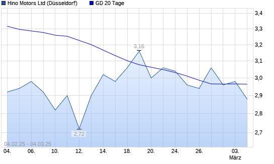 Mit dem Anstieg auf 3,00 EUR hat die Hino Motors-Aktie am 03.03.2025 die 20-Tage-Linie nach oben gekreuzt.