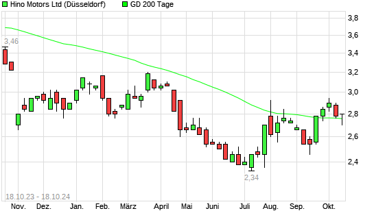 Mit dem Anstieg auf 2,78 EUR hat die Hino Motors-Aktie am 17.10.2024 die 200-Tage-Linie nach oben gekreuzt.
