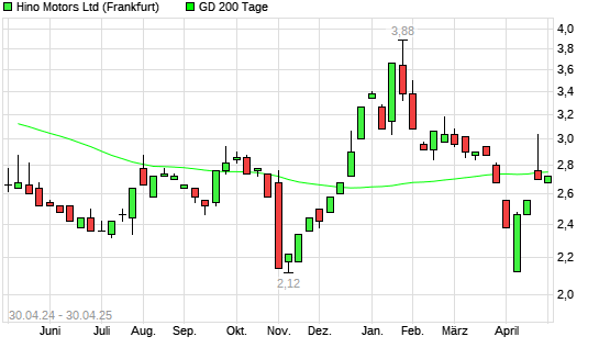 Mit dem Rücksetzer auf 2,70 EUR hat die Hino Motors-Aktie am 29.04.2025 die 200-Tage-Linie nach unten gekreuzt.