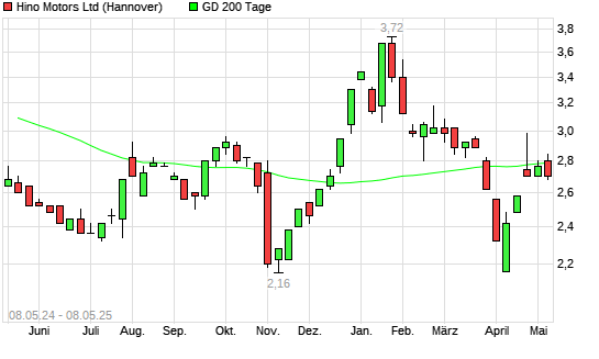 Mit dem Rücksetzer auf 2,68 EUR hat die Hino Motors-Aktie am 07.05.2025 die 200-Tage-Linie nach unten gekreuzt.