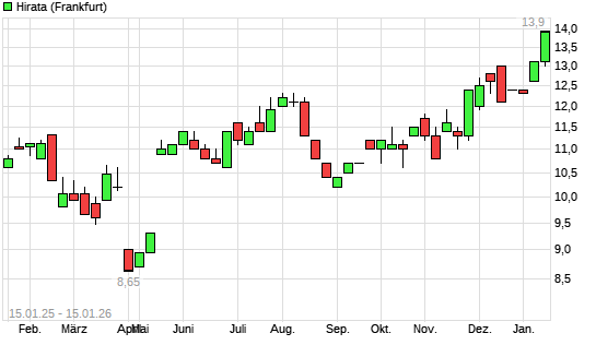 Mit dem Anstieg auf 13,50 EUR hat die Hirata-Aktie (ISIN JP3795300007) am 14.01.2026 ein neues 12-Monats-Hoch erreicht und damit den Kurs vom 13.01.2026 eingestellt.
