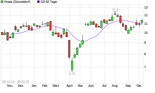 Mit dem Anstieg auf 11,10 EUR hat die Hirata-Aktie am 08.10.2025 die 50-Tage-Linie nach oben gekreuzt.