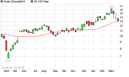 Mit dem Rücksetzer auf 13,10 EUR hat die Hirata-Aktie am 20.03.2026 die 100-Tage-Linie nach unten gekreuzt.