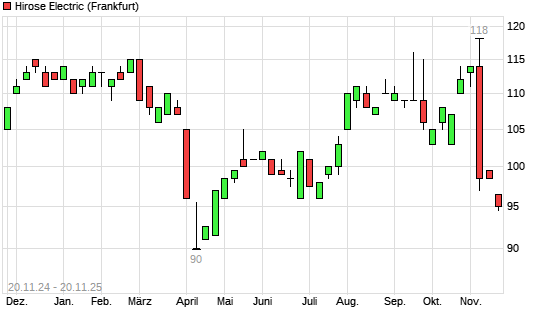 Mit dem Rücksetzer auf 94,50 EUR hat die Hirose Electric-Aktie (ISIN JP3799000009) am 19.11.2025 ein neues 6-Monats-Tief erreicht und damit den Kurs vom 18.11.2025 eingestellt.