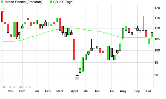 Mit dem Anstieg auf 107,00 EUR hat die Hirose Electric-Aktie am 09.10.2025 die 200-Tage-Linie nach oben gekreuzt.
