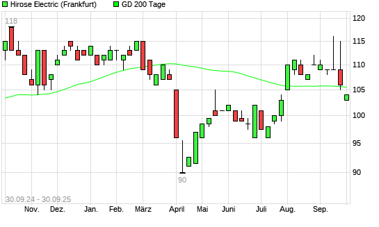 Mit dem Rücksetzer auf 103,00 EUR hat die Hirose Electric-Aktie am 29.09.2025 die 200-Tage-Linie nach unten gekreuzt.