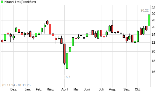 Mit dem Anstieg auf 29,74 EUR hat die Hitachi-Aktie (ISIN JP3788600009) am 31.10.2025 ein neues All-Time-High erreicht und damit den Kurs vom 30.10.2025 eingestellt.
