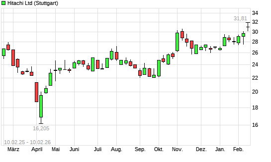 Mit dem Anstieg auf 31,31 EUR hat die Hitachi-Aktie (ISIN JP3788600009) am 09.02.2026 ein neues All-Time-High erreicht und damit den Kurs vom 03.11.2025 eingestellt.